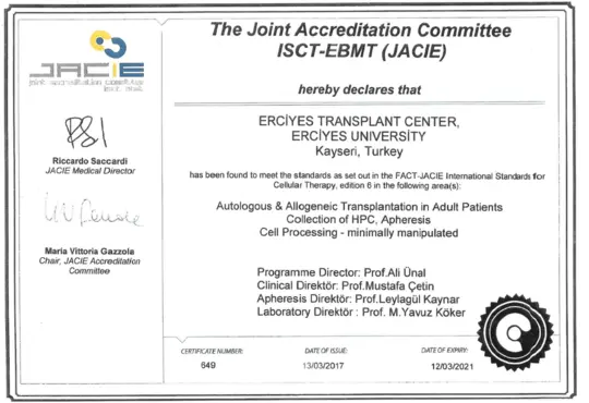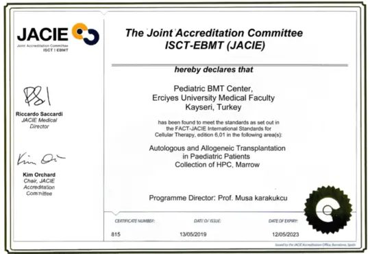 SAHINUR DEDEMAN is the first center to receive JACIE (Joint Accreditations Committee of ISCT and EBMT) accreditation for adult bone marrow transplants in Türkiye.